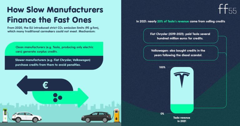 In 2021, nearly 20% of Tesla’s revenue came from selling CO₂ credits (Financial Times). In other words, European manufacturers indirectly financed Tesla’s global expansion.