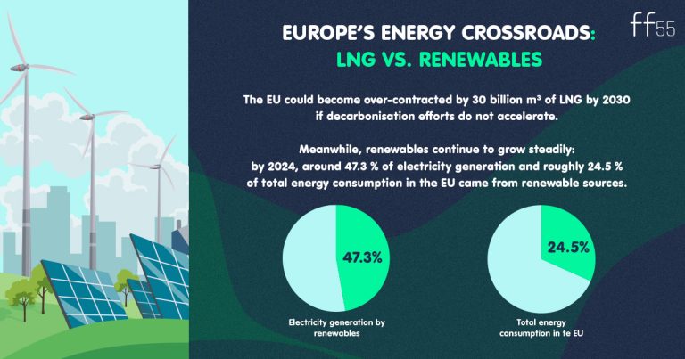 Analyses by ACER suggest that the EU could become over-contracted by 30 billion m³ of LNG by 2030 if decarbonisation efforts do not accelerate.Meanwhile, renewables continue to grow steadily: by 2024, around 47.3 % of electricity generation and roughly 24.5 % of total energy consumption in the EU came from renewable sources. Eurostat, European Commission, EMBER Energy