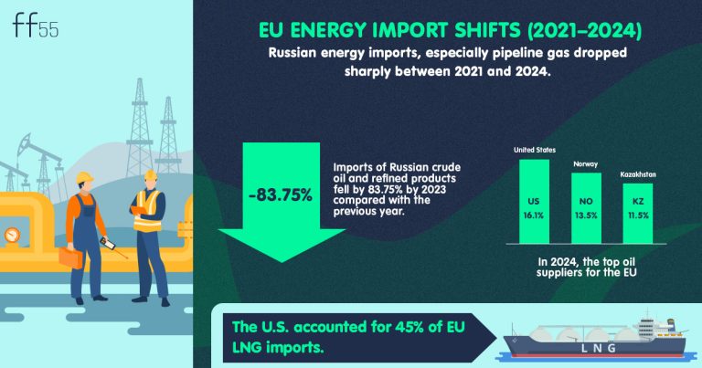 The Fit for 55 (FF55) package aims to reduce EU greenhouse gas emissions by at least 55 % by 2030 compared with 1990 levels. Within this framework, energy independence is understood not as a shift to new fossil suppliers, but as a structural reduction in fossil energy use, increased electrification, and expansion of clean technologies.