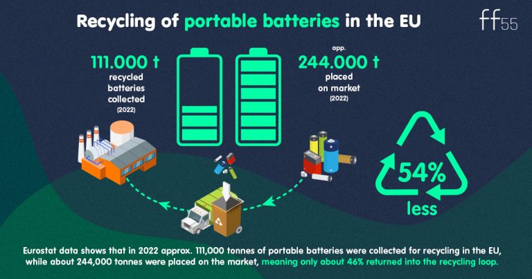 Eurostat data shows that in 2022 approx. 111,000 tonnes of portable batteries were collected for recycling in the EU, while about 244,000 tonnes were placed on the market, meaning only about 46% returned into the recycling loop.